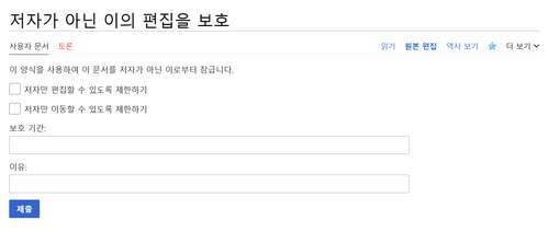 관리자가 아닌 사용자는 편집 탭 옆의 '더 보기'를 누른 다음 보호라고 쓰인 링크를 클릭하면 다음과 같은 내용이 나옵니다.