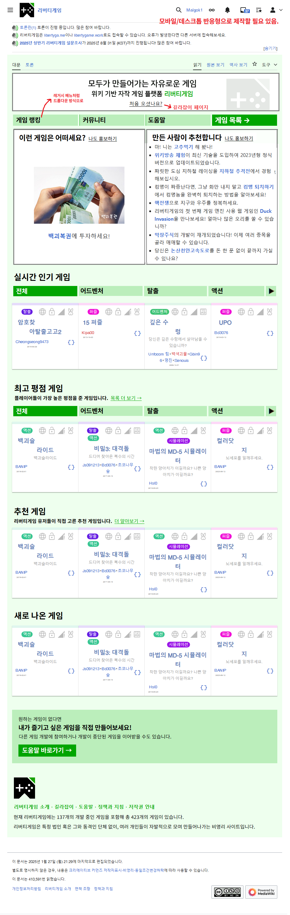 - 저도 차라리 게임 개발자가 광고와 업데이트를 등록하기에는 과거 버전이 더 낫다고 생각하고 있습니다. 그리고 처음 온 사용자가 길라잡이로 바로 이동할 수 있도록 맨 위에 링크를 넣어 둔 것도 마음에 듭니다. 현재 대문에서 게임 목록으로 이동하려면 사이드바나 맨 밑으로 가야 했는데 이 부분이 많이 개선되었네요. 하지만 게임 광고와 업데이트가 나란히 있는 부분을 모바일 친화적으로 설계하는 것이 과제겠네요. — hsl(토론, 기여, 게임, 메일) 2025년 8월 20일 (수) 08:52 (KST)